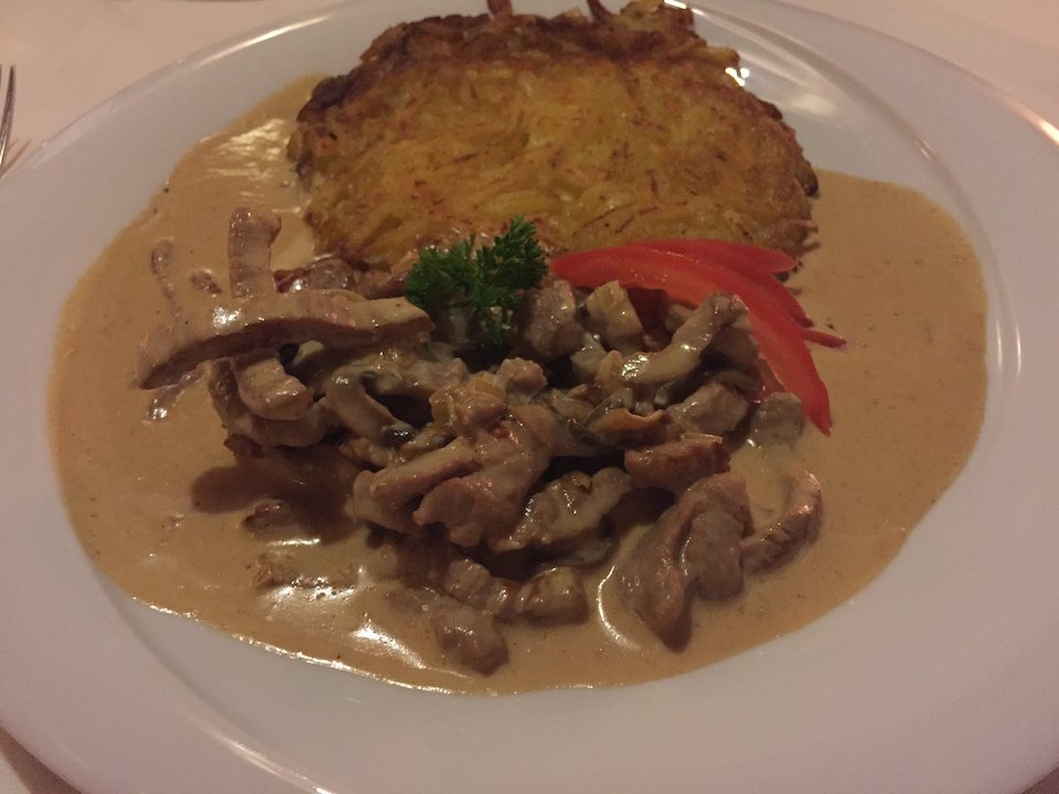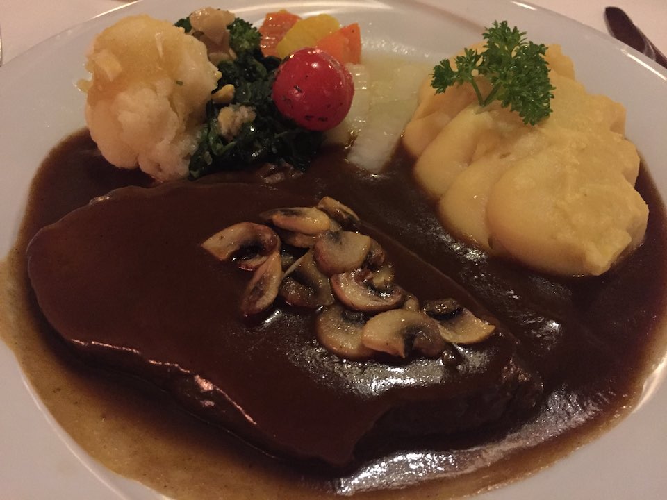 The taste was ordinary. My wife, on the other hand, had this pork dish as her main course. If anything, this dish matches the image of Swiss-like food. The side dish of potatoes was also like that.