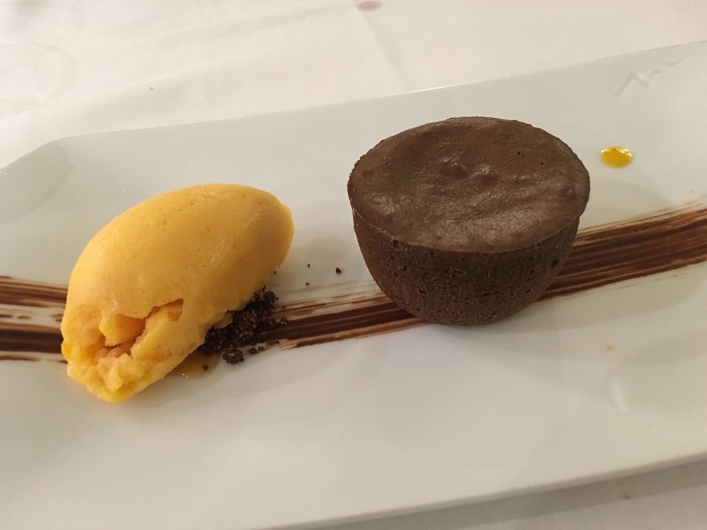 The dessert is mel au chocolat (fondant chocolate) with orange sorbet.
