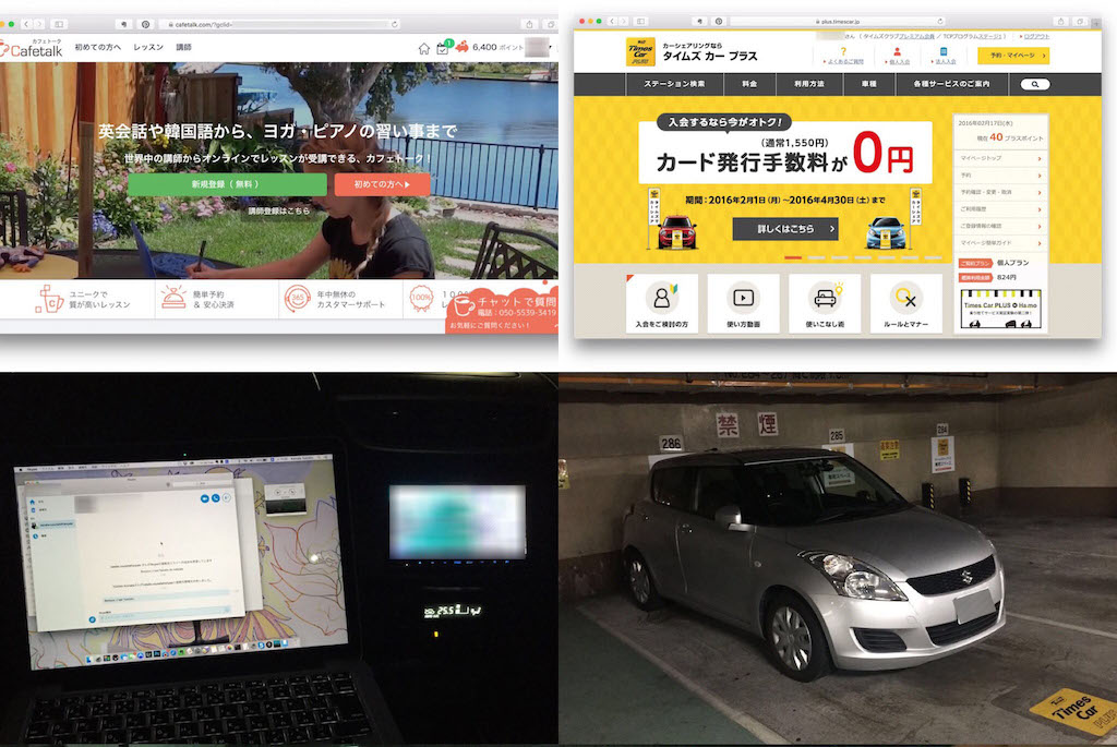 Whenever I got stuck, he would immediately type in the Skype chat box. The typing speed was fast and good, and I can read simple sentences, so this was very helpful. I can read simple sentences, so this was very helpful. The lesson ended in 40 minutes. It went by very fast. I said a quick thank you and disconnected Skype. After that, I put away my Mac, put the key back in the passenger dashboard, got out of the car, and locked the door by holding my membership card over the panel I touched when I locked the door the first time. This completes the return.