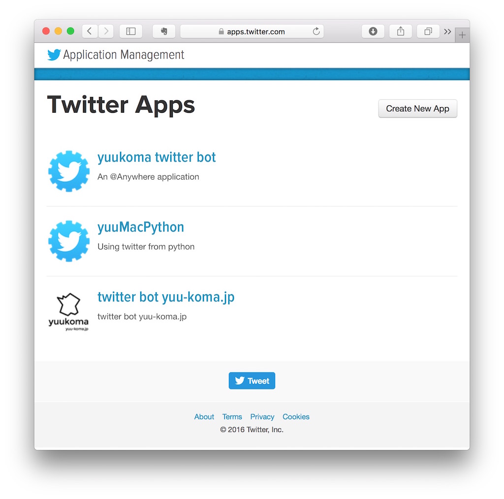 初めにTwitter Application Managementに行き、“Create New App”のボタンを押して新しいアプリを作成します。指示に従えば簡単に手続きが完了し、トップページの「Twitter Apps」に追加されたアプリが表示されるはずです。
