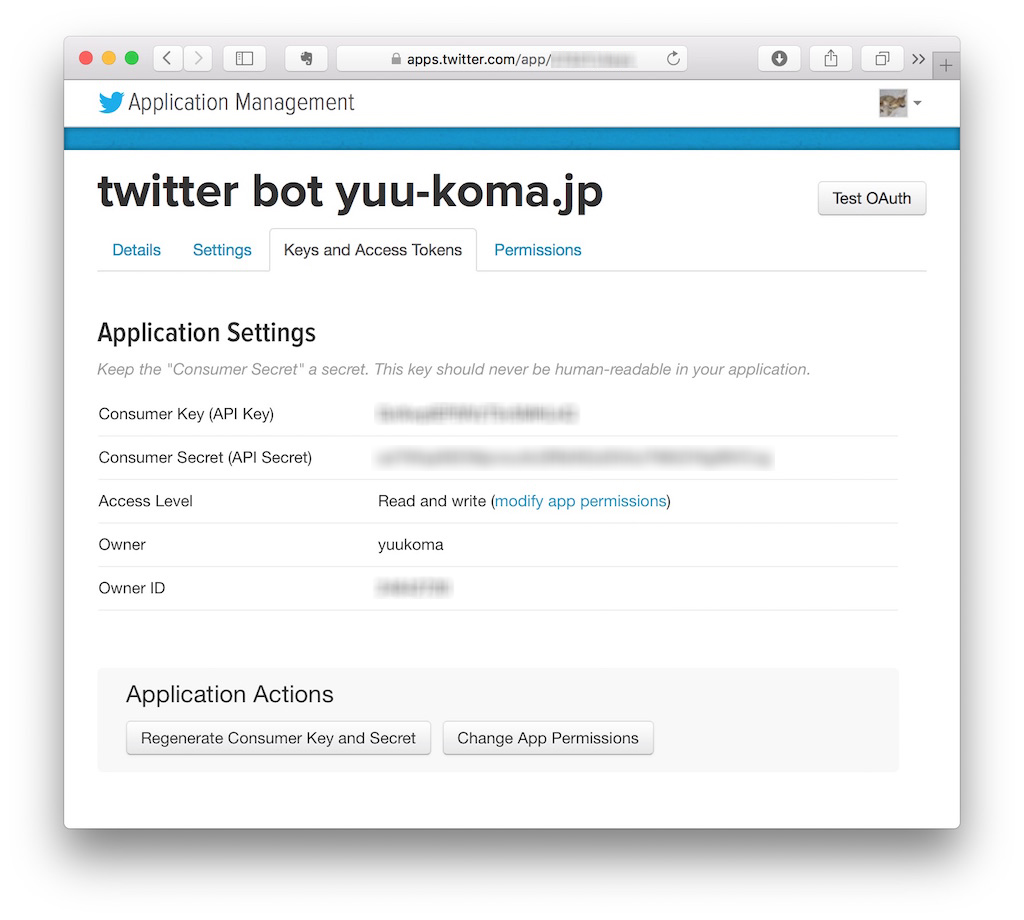 続いて作成したアプリの各種トークン」を取得します。トップ画面から作成したアプリを選択、[highlight]“Keys and Access Tokens”[/highlight]というタブがあるのでそれを選択。