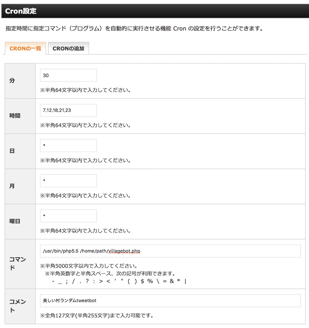 最後にレンタルサーバーのcronを設定します。path、設定方法はサーバー(レンタルサーバー)ごとに違いますので、適宜変更してください。以下は私が使っているエックスサーバー