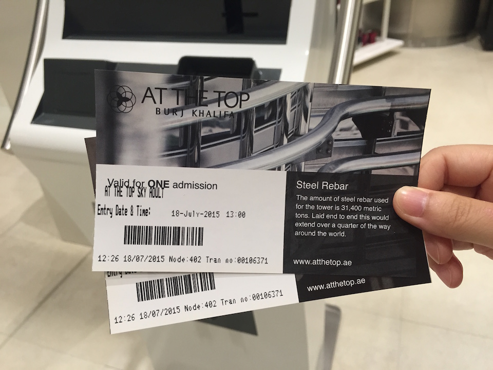 そして、もう一つは148階の特別展望台と125階展望台両方行けるプラン[highlight]「AT THE TOP, BURJ KHALIFA SKY TICKET TYPE」[/highlight]。こちらの料金(大人)は時間帯によらず一律500AEDと結構なお値段。円換算すると16,000円程度でしょうか。