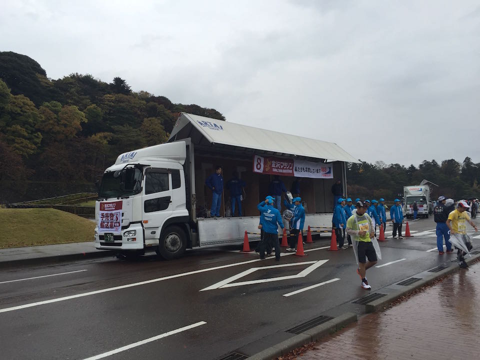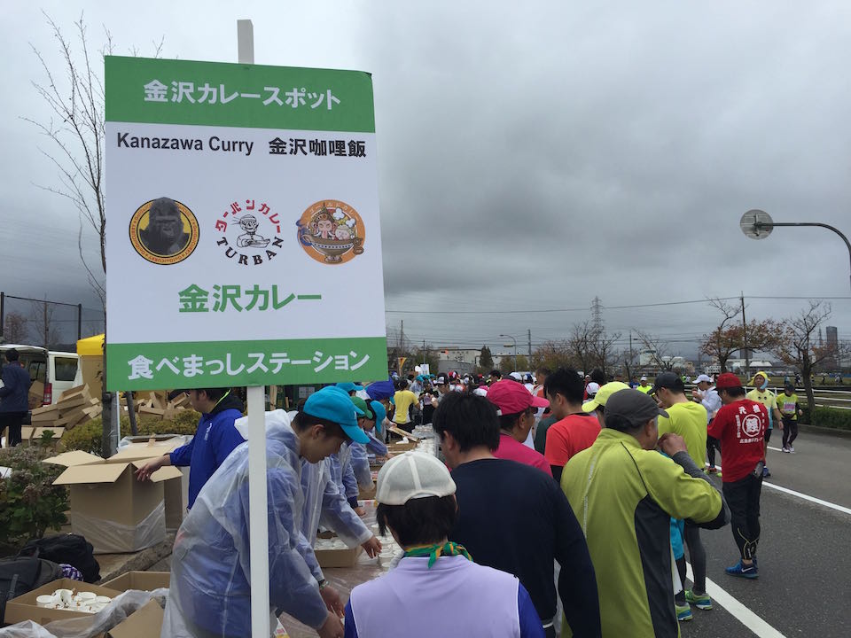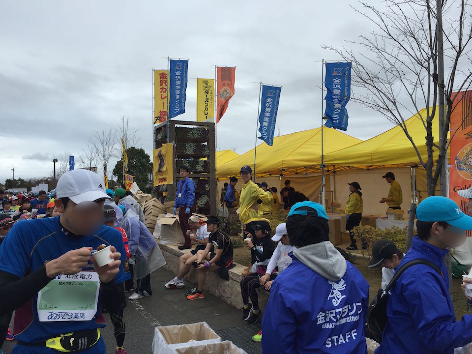 [highlight]今大会バナナ以外唯一の給食[/highlight]でした。パンフでは金沢の銘菓やお米などが給食として出ると書いてあったのですが、僕は一切食べることができませんでした。やはり下位ランナーまでは支給されない模様。去年の奈良マラソンを思い出します。下位ランナーはもう自前で食べ物を手配する以外ないのでしょうか。