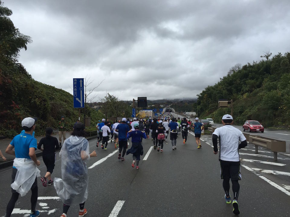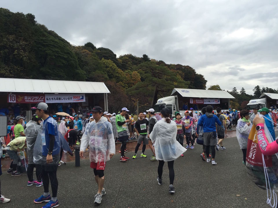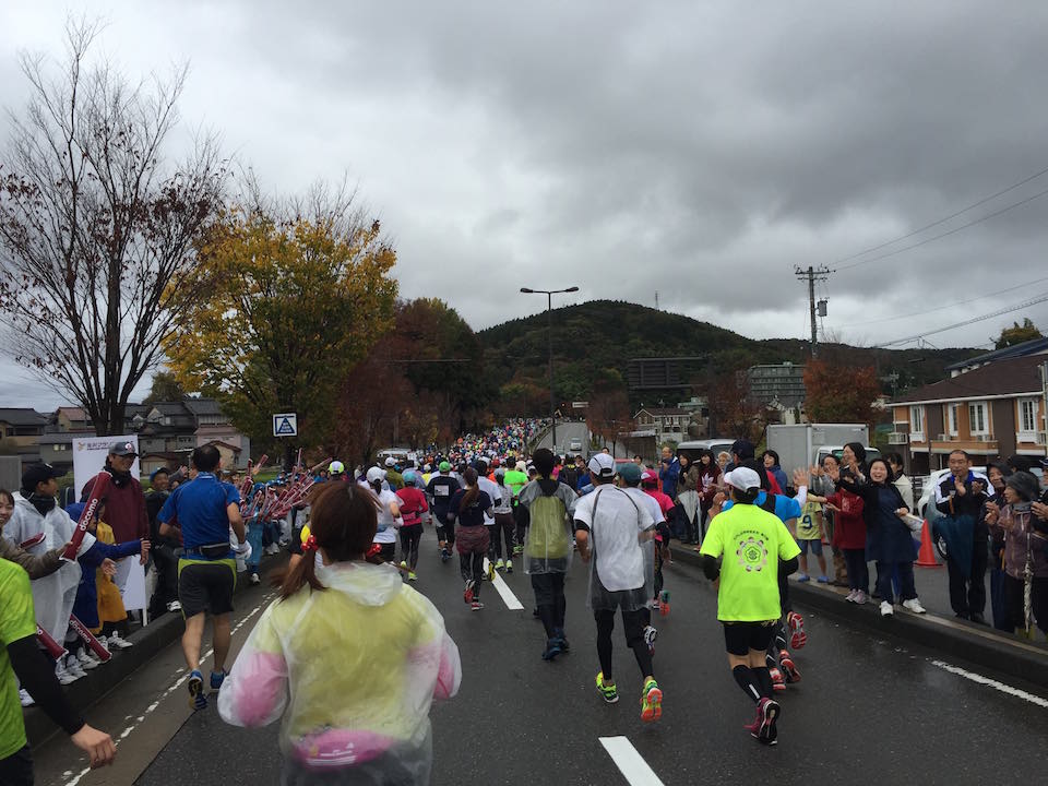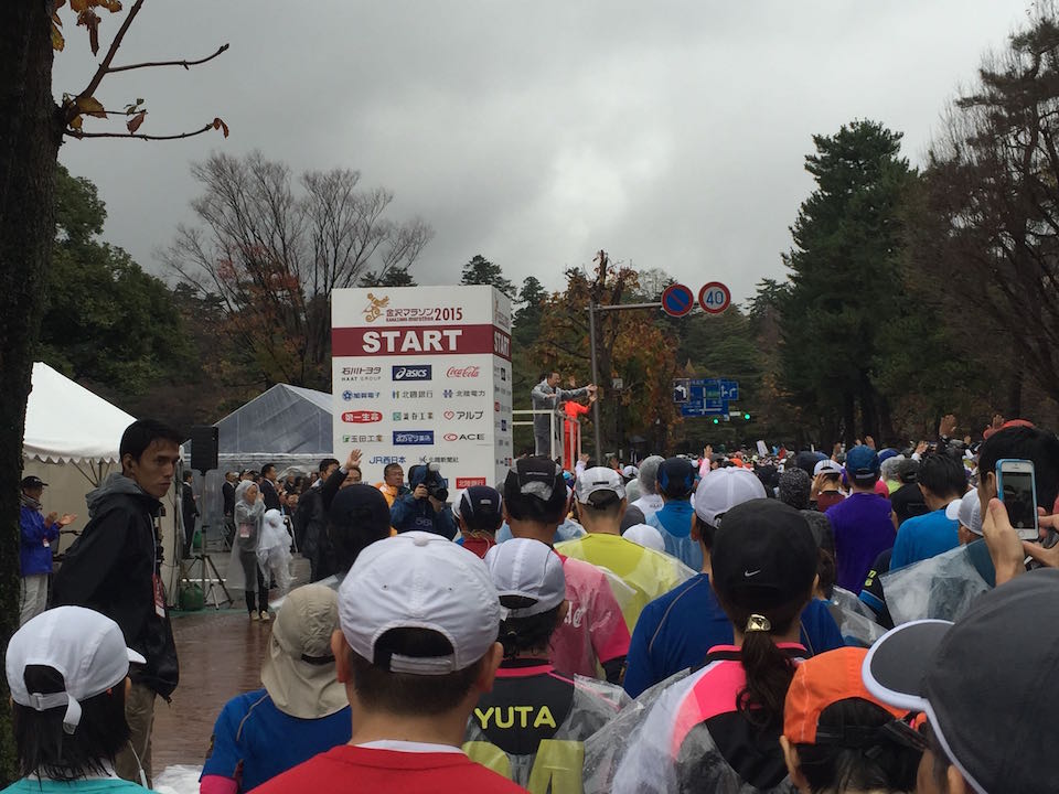 After dropping off our bags, we did a quick warm-up at Shinoki Green, and then lined up at the starting block at about 8:15. At this time, less than 30% of people were still there. However, after 8:15, when the deadline for depositing luggage in the trucks had passed, people suddenly started to gather.