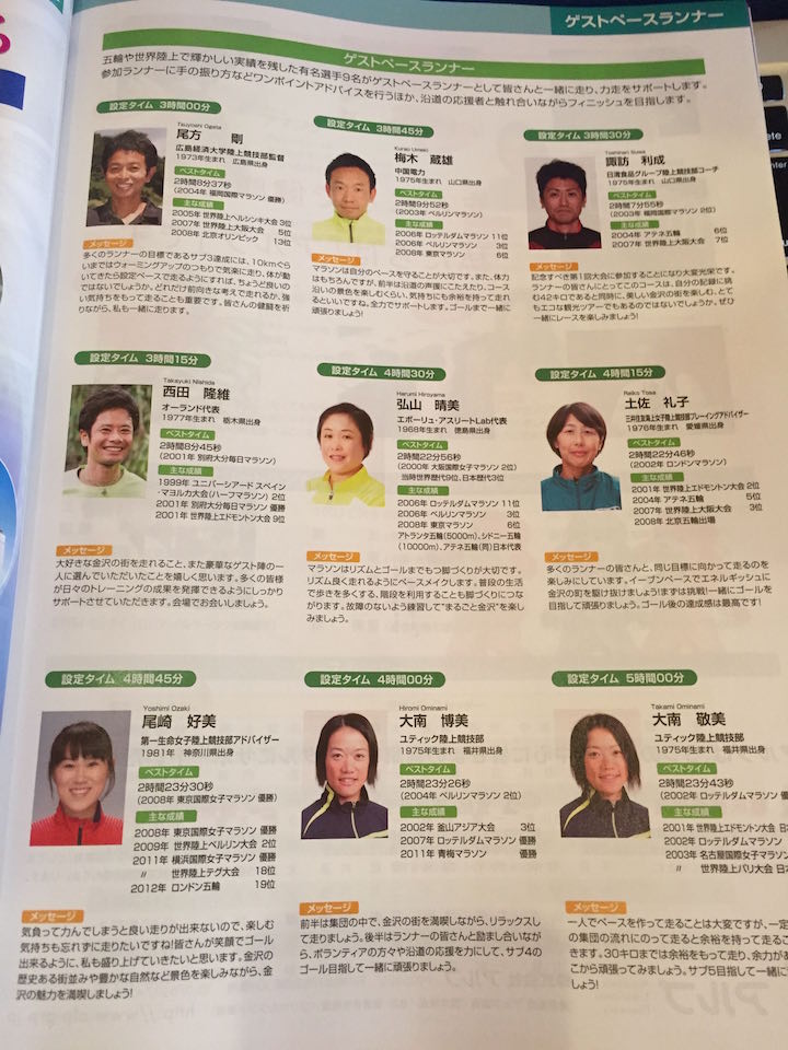 前半20kmしか走らないこと、そして上位のブロックの人しか出会う機会がないのですが、設定タイム3時間:尾方剛さん、設定タイム3時間15分:西田隆維さん、設定タイム3時間30分:諏訪利成さん、5時間までは15分毎にペースランナーがいるので少し飛びますが、設定タイム4時間15分:土佐礼子さん、設定タイム4時間30分:弘山晴美さんと、歴代の日本の名ランナーたちが勢揃いしているのです。結構豪華!まあ陸上好きでないとなんだかわからないと思いますが(笑)。長年、箱根駅伝を観戦していればお馴染みのメンバーですよね。