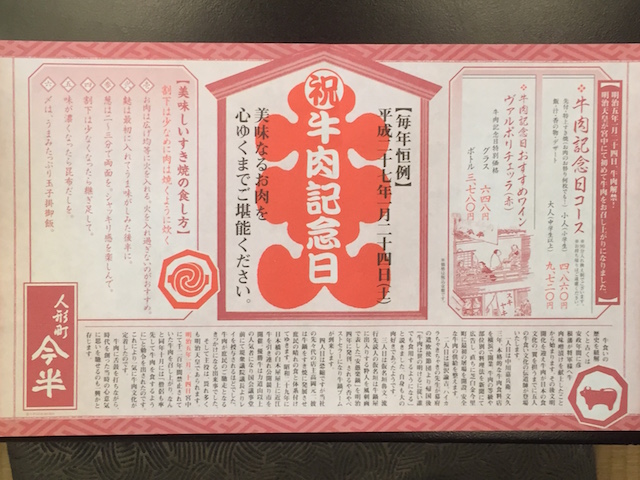 "明治5年1月24日、宮中にて明治天皇が1200年間禁止されていた牛肉を召し上がり、これにより一気に牛肉文化が定着"、これを記念して毎年この日は90分一本勝負のすき焼き食べ放題を味わうことができるのです。