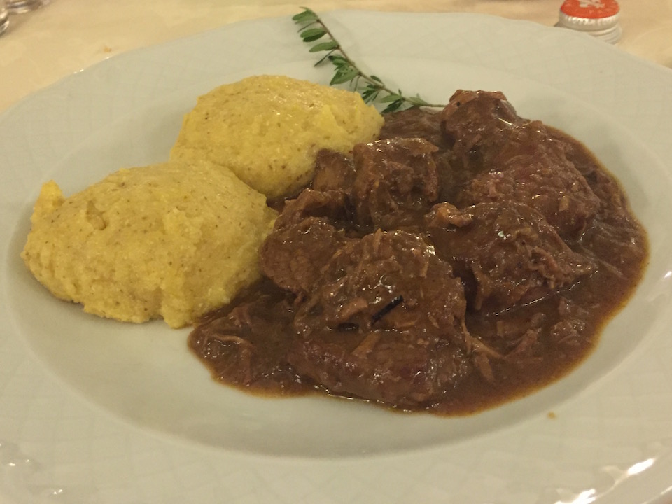 ということで、このあたりのエリアの料理は、当然ながらドイツ・オーストリア色が強くなります。コルティーナ・ダンペッツォ(ここはヴェネト州ですがやはりドイツ語割合多め)では、メインで[highlight]グヤーシュ(オーストリア・ハンガリーの伝統料理、いわゆるビーフシチュー)[/highlight]が出てました。