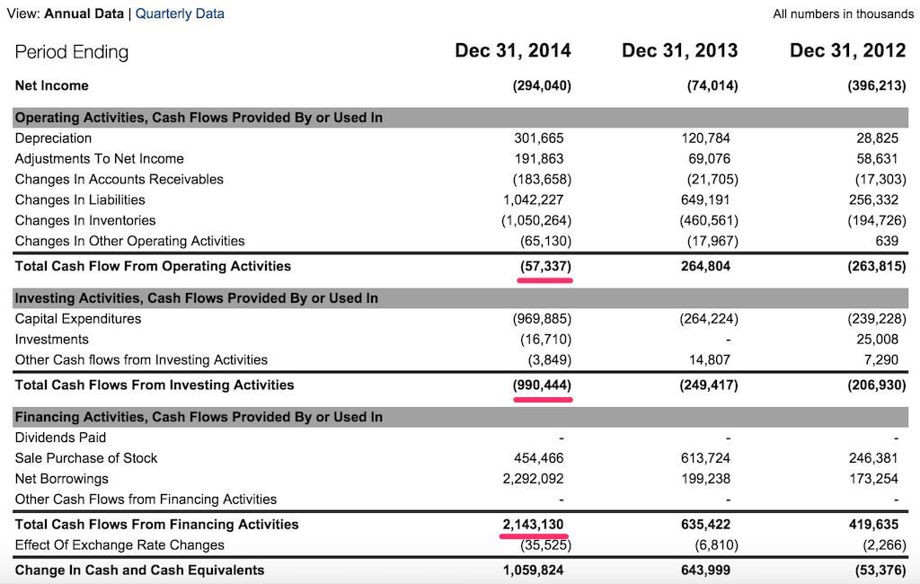 TSLA Cash Flow | Tesla Motors, Inc. Stock – Yahoo! Finance http://finance.yahoo.com/q/cf?s=TSLA+Cash+Flow&annual より。